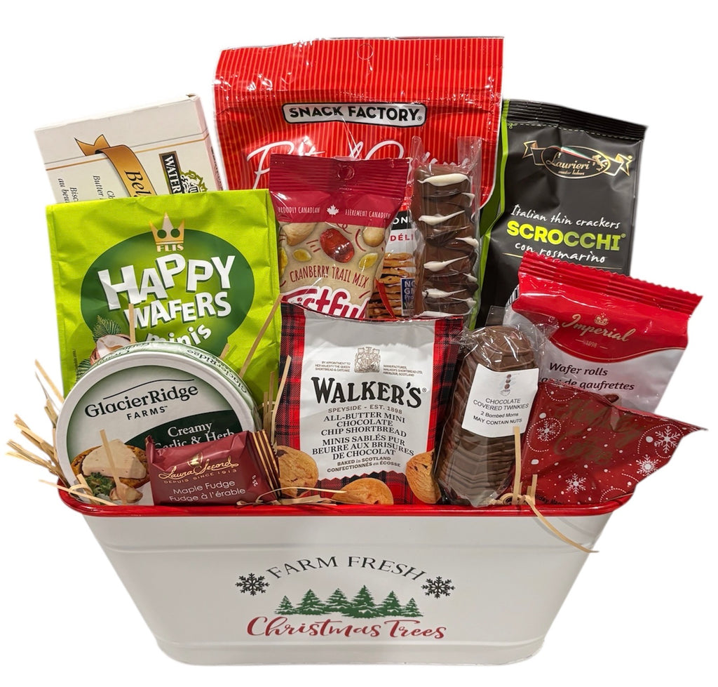 An assortment of sweet and savoury including biscuits, wafers, coffee, chocolates, cheese, crackers and more.