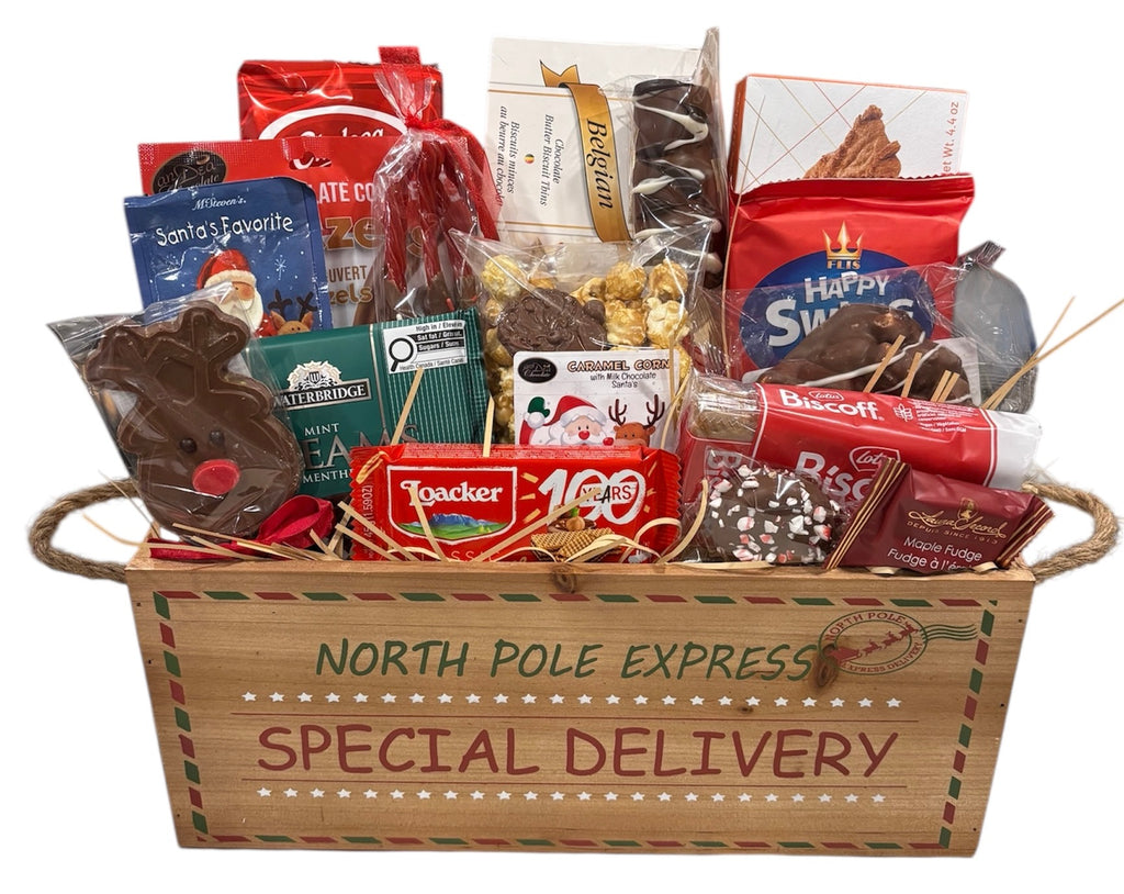 This is an all sweet basket! It contains all sorts of cookies, wafers, hot chocolate, biscuits, chocolate, popcorn and chocolate covered treats.